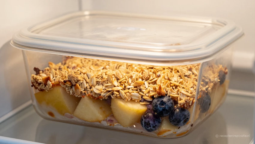 Bewaar de crumble afgedekt in de koelkast. Het is het lekkerst als je het binnen 2 dagen opeet. Je kunt het ook invriezen voor maximaal 2 maanden.