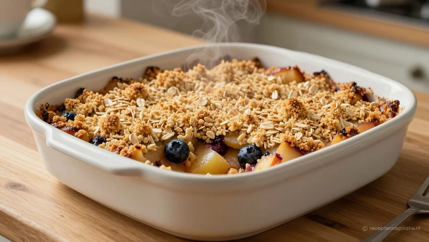 Tip voor een extra knapperige crumble: Voeg een snufje zeezout toe aan de havermoutmix en gebruik koude boter of plantaardige boter voor een mooie, knapperige structuur. Let op: het basisrecept bevat niet veel suiker, maar je kunt dit naar smaak aanpassen en eventueel een beetje extra suiker toevoegen als je het iets zoeter wilt.
