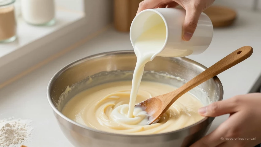 Klop de eieren los in een aparte kom en voeg ze geleidelijk toe aan het droge mengsel. Begin met een klein beetje en meng het voorzichtig door de bloem, zodat er geen klontjes ontstaan. Voeg vervolgens de melk in gedeeltes toe, terwijl je blijft roeren, totdat het beslag glad en vloeibaar is. Het is belangrijk om de melk en eieren geleidelijk toe te voegen om te voorkomen dat het beslag te dik of te dun wordt. Blijf roeren totdat er een glad beslag ontstaat zonder klontjes. Een goed beslag is soepel en vloeit gemakkelijk van de lepel.