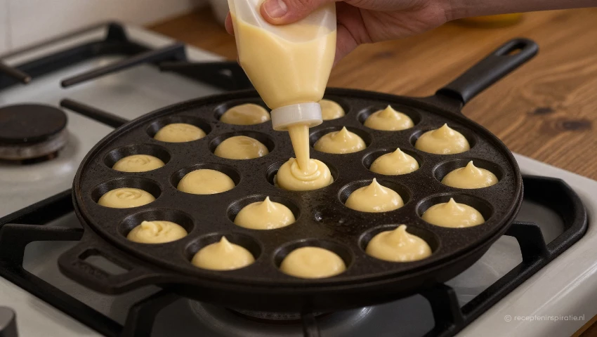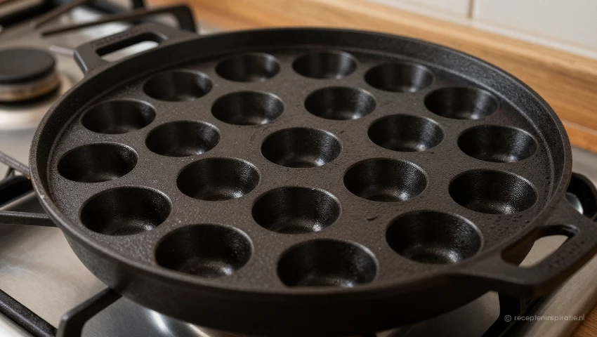 Plaats de poffertjespan op middelhoog vuur en laat deze goed warm worden. Vet de pan in met een beetje boter of olie om te voorkomen dat de poffertjes blijven plakken. Gebruik een zachte kwast of een stukje keukenpapier om de boter of olie gelijkmatig over de pan te verdelen. Controleer of de pan goed warm is door een klein beetje beslag in de pan te druppelen. Als het direct begint te sissen, is de pan warm genoeg. Een goed verwarmde pan is essentieel voor het creëren van goudbruine en luchtige poffertjes.