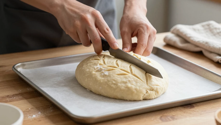Gebruik net voor het bakken een scherp mes om de bovenkant van het brood in te snijden. Dit voorkomt dat het brood tijdens het bakken scheurt en geeft het een mooie, gecontroleerde vorm. Je kunt kiezen voor verschillende patronen, van een eenvoudige kruisvorm tot een complexer ontwerp. Zorg dat de sneden 1–2 cm diep zijn, diep genoeg om het brood te laten rijzen, maar niet zo diep dat de bodem wordt beschadigd.