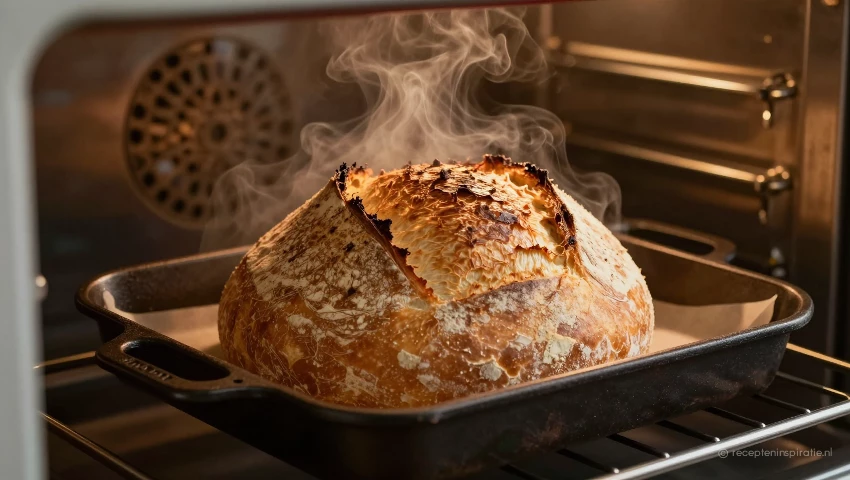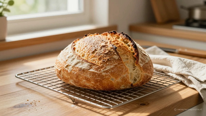 Plaats het brood voorzichtig in de hete oven en bak het 20–25 minuten, tot het goudbruin en knapperig is. Haal het brood uit de oven en laat het volledig afkoelen op een rooster voordat je het aansnijdt, zodat de textuur en smaak zich goed ontwikkelen.