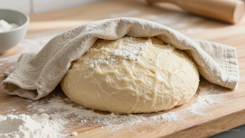 Plaats het deeg in een licht ingevette kom en dek af met plasticfolie of een vochtige doek. Laat het 4–6 uur rijzen op kamertemperatuur, of totdat het deeg in volume verdubbeld is.