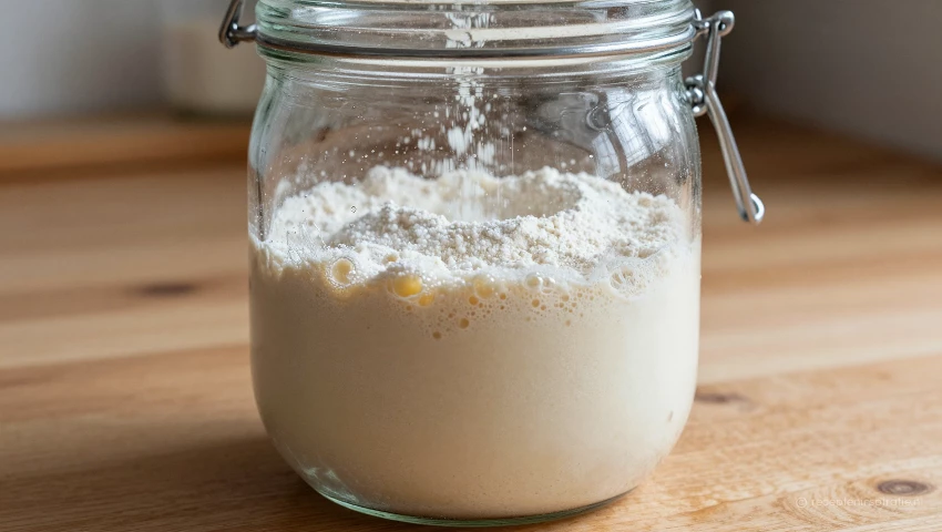 Begin met het mengen van 50 gram bloem en 50 ml water in een schone glazen pot. Roer goed totdat er geen droge stukken meer zijn en je een glad, samenhangend mengsel hebt. Het is belangrijk om een schone pot te gebruiken om ongewenste bacteriën te voorkomen. Dit mengsel vormt nu je basisstarter, die de komende dagen zal fermenteren. Zorg dat de pot ruim genoeg is, want de starter zal tijdens het fermentatieproces in volume toenemen. Sluit de pot losjes af met een deksel of een doek, zodat er lucht kan ontsnappen terwijl de starter actief wordt.