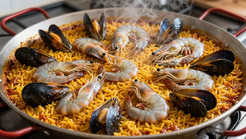 Paella is een kleurrijk en smaakvol Spaans rijstgerecht, traditioneel bereid in een grote, platte pan. Deze versie combineert de heerlijke smaken van kip en zeevruchten voor een complete en feestelijke maaltijd.