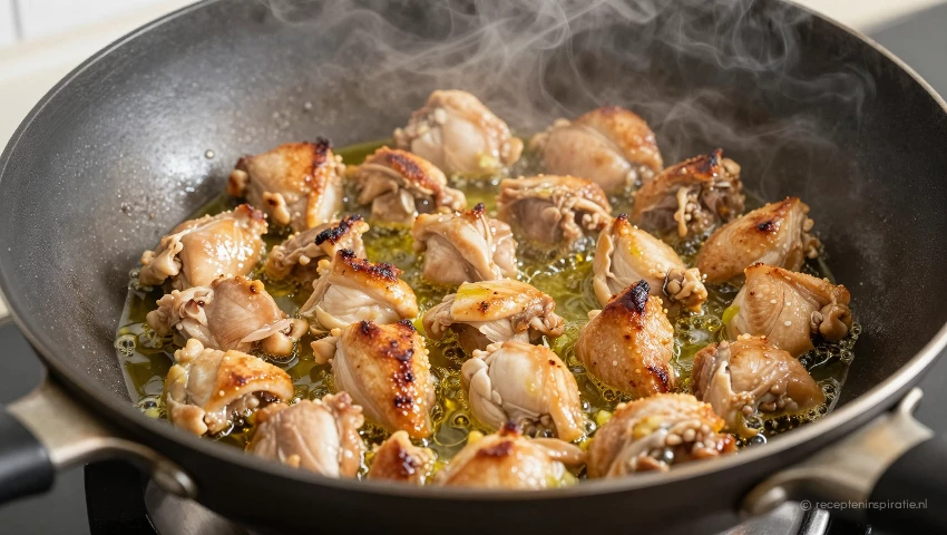 Verhit de olijfolie in een grote paellapan of brede koekenpan. Bak de kipblokjes goudbruin en haal ze uit de pan. Voeg vervolgens de gesnipperde ui toe en fruit deze glazig. Voeg de fijngehakte knoflook toe en bak deze kort mee tot de geur vrijkomt. Het is belangrijk om de kip niet te gaar te bakken, want deze gaart nog verder door in de paella. De ui en knoflook vormen de basis van de smaak, dus neem hier de tijd voor.