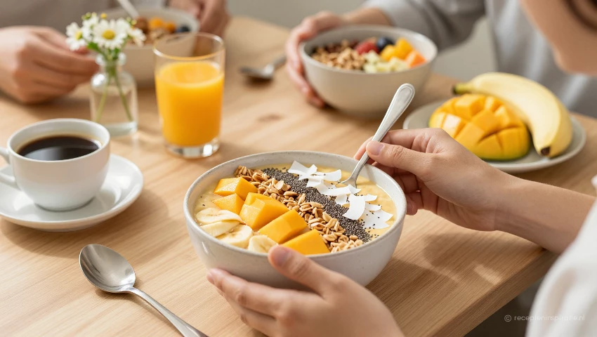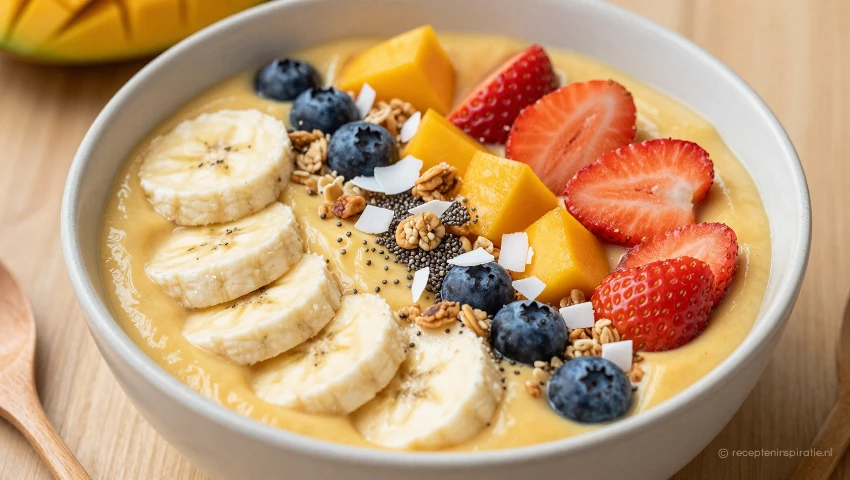 Deze vegan smoothiebowl met mango, banaan en chiazaad is een heerlijke en gezonde start van de dag. Het is een makkelijk te maken ontbijt vol vitamines en vezels, perfect voor een energieke ochtend.