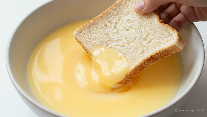 Doop de sneetjes brood één voor één in het eimengsel, zodat beide kanten goed bedekt zijn. Laat het brood even wellen in het mengsel, maar zorg ervoor dat het niet te lang duurt, anders wordt het te zacht en valt het uit elkaar. Het brood moet verzadigd zijn met het eimengsel, maar nog wel zijn vorm behouden. Haal het brood voorzichtig uit het mengsel en laat het even uitlekken.