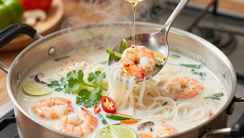 Geniet van deze heerlijke Thaise kokosnoedelsoep met garnalen, een smaakvolle en snelle maaltijd die je meeneemt naar de smaken van Thailand. Deze soep combineert de romigheid van kokosmelk met de delicate smaak van garnalen en de verfrissende kruiden van de Thaise keuken.