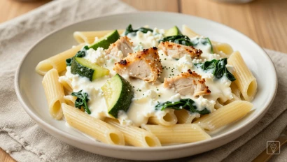 Snelle pasta met cottage cheese, kip, spinazie en courgette